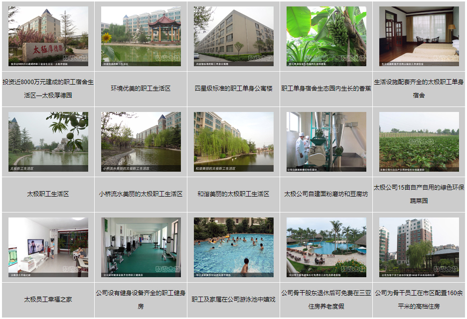 在2008年,太極公司投資近8000萬元建成了職工公寓樓3座,戶外綠樹溪湖環(huán)繞,每戶面積170平米,統(tǒng)一配置60寸夏普電視等。所建成的職工單身公寓樓采用四星級標(biāo)準(zhǔn),共176間房,人均戶面積50平米,統(tǒng)一配置電視、網(wǎng)絡(luò)、洗浴間、床柜、空調(diào)、暖氣、桌椅等。而且單身公寓內(nèi)設(shè)有3000余平方米的生態(tài)園林和高檔游泳池,一年四季綠樹茂盛常春。